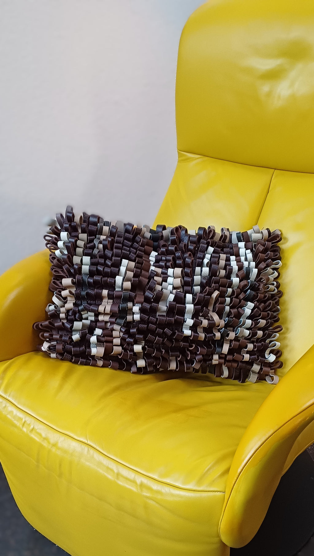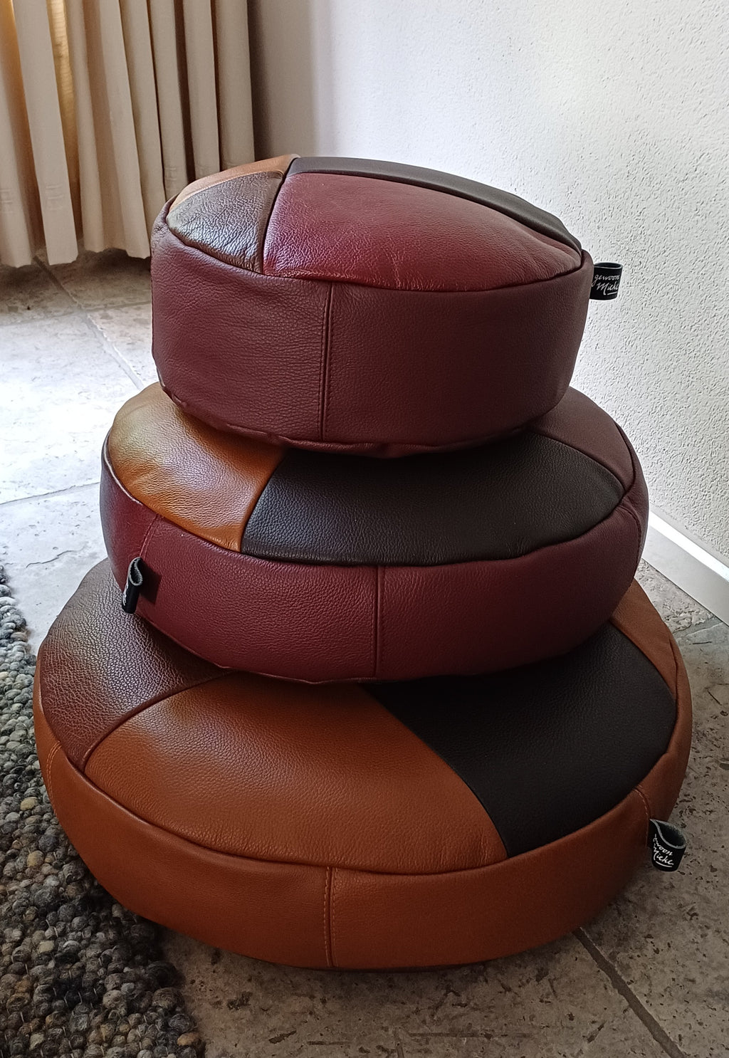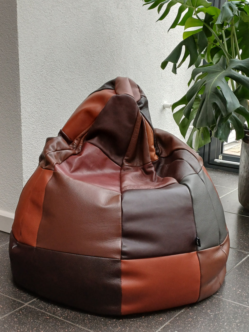 De restanten leer uit de meubel- schoenen- of tassenindustrie verwerk ik tot exclusieve woonmode. Door het recyclen van kleine stukken leer is elk kussen, elke poef of zitzak uniek.