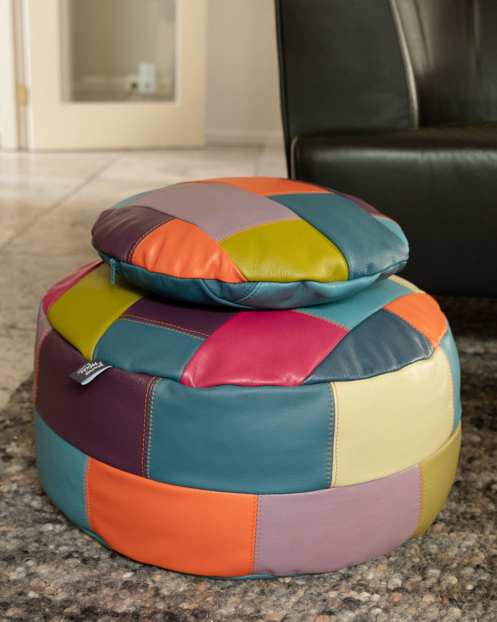 De restanten leer uit de meubel- schoenen- of tassenindustrie verwerk ik tot exclusieve woonmode. Door het recyclen van kleine stukken leer is elk kussen, elke poef of zitzak uniek.